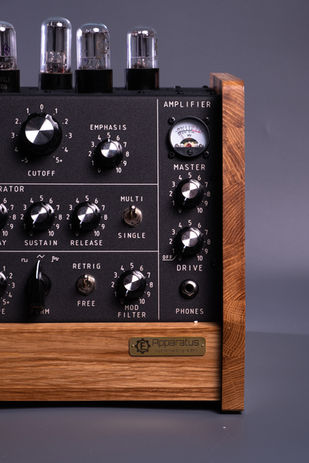 Apparatus is the first duophonic synthesizer. The audio path of the instrument, completely created on the basis of vacuum and gas-filled radio tubes using circuitry solutions in the spirit of the first half of the 20th century, is controlled by a modern powerful processor based on the ARM core, which ensures stability of characteristics and instant response to the artist's manipulations. All synthesizers are hand-assembled and produced in a limited edition.